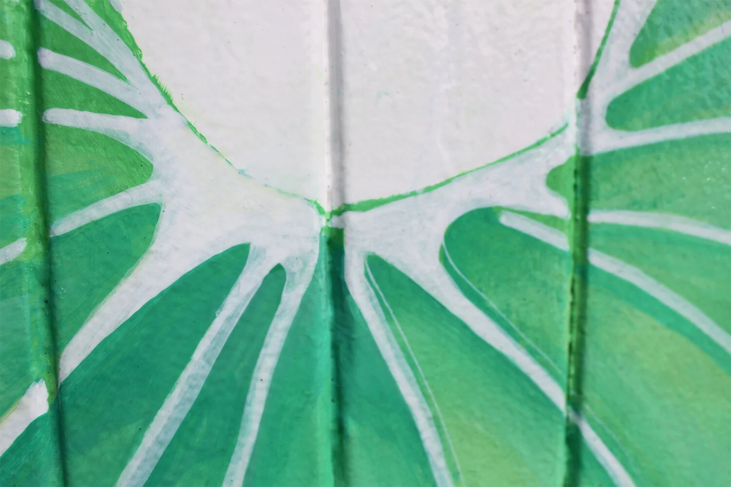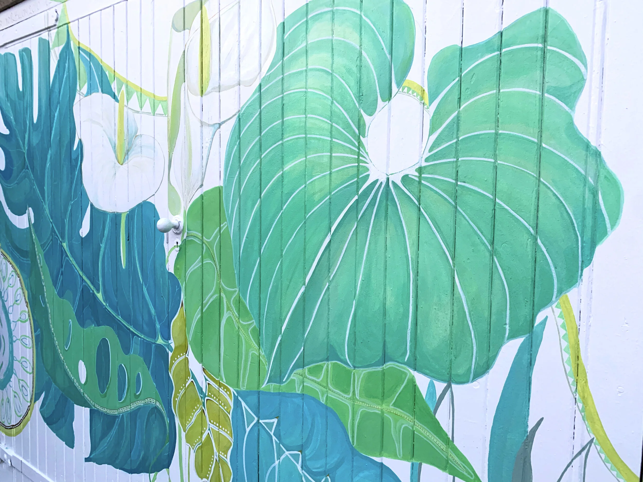 Later that summer, the property owners contacted me because although they did not want to erase the messages they did want to find a longer-term creative solution to honouring the protests beautifully and permanently. My brief was to create a design that spoke to the of valuing Black lives and of African heritage. The resulting mural is a lush celebration of plants interwoven with patterns from across the continent. Some patterns form a backdrop to the plants, others adorn and add texture to the foliage. Click on the images to view in detail.